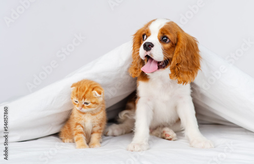 Puppy king charles spaniel sitting on bed next to kitten of scottish breed