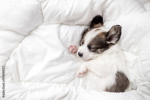 puppy sleeping on bed with ears up.dog wrapped in blanket,only nose visible.domestic pet in bedroom yawning, playing or whining.little animal inside home.portrait close up