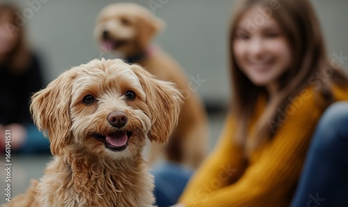 Puppy socialization class, where pets and their owners participate in training sessions to teach dogs how to interact and socialize with others. This image highlights the importance, Generative AI