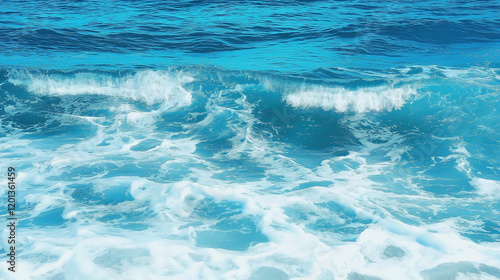 Pure blue turquoise water texture of the ocean sea with foam from and waves