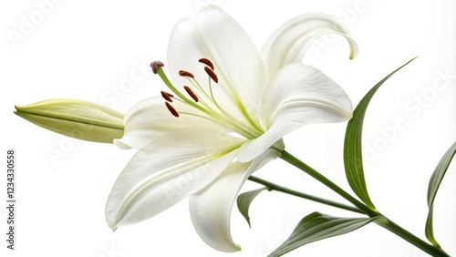 Pure white lily flower with delicate petals isolated on a crisp white background, white blooms, elegant flower, minimalist design