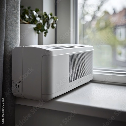 Purifier sits on a windowsill, plant, curtain, and neighborhood view beyond