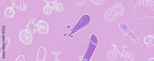 Purple background pattern with outlined bikes, skateboards, and roller blades.