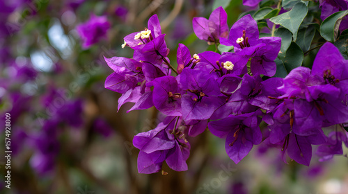 Purple Bougainvillea tropical flower bush climbing vine landscape garden plant growing in wild with fresh and some dried flower petals.
