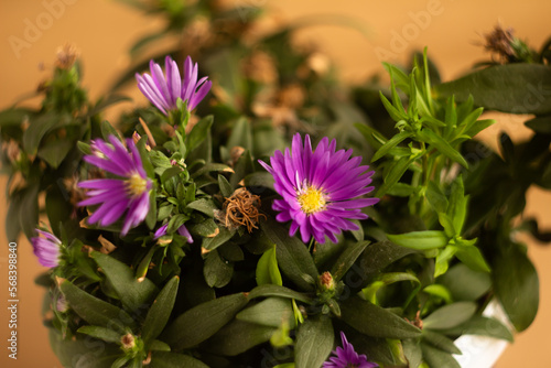 purple chrysanthemum flowers - with yellow centers and green leaves with a defocused foreground on a light brown background