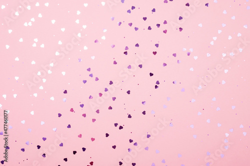 Purple glittering hearts on a pink pastel background. Festive background.