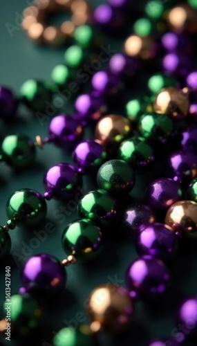 Purple, green, gold Mardi Gras beads; festive, colorful, celebratory strings , green, bright, detail