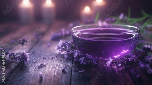 Purple Lavender Essence in Elegant Bowl Surrounded by Flowers