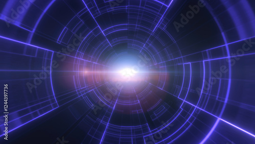 Purple neon tunnel with glowing concentric lines and radiant central light, evoking a sci-fi, immersive atmosphere with a futuristic and digital appeal background