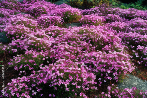 Purple, pink carpet of Phlox Subulata (creeping phlox, moss phlox, moss pink, or mountain phlox) flowers.