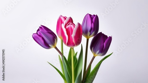 Purple pink tulip bouquet on white background. greeting card. Woman day concept. Copyspace for text.