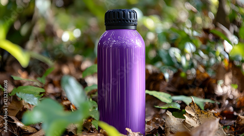Purple Reusable Water Bottle Stands Majestically amidst Fallen Leaves in a Lush Forest Setting.