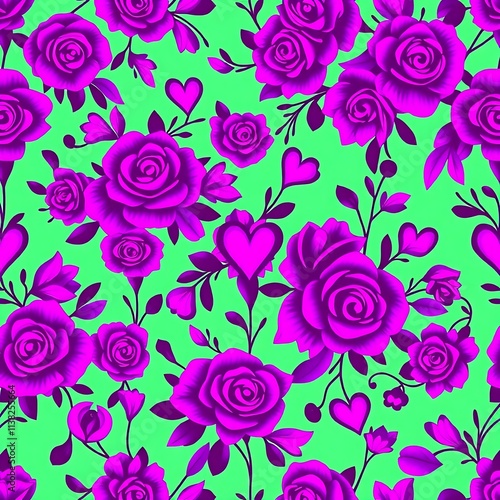 Purple Roses & Hearts Seamless Pattern: A vibrant and romantic seamless pattern featuring lush purple roses blooming amidst a field of playful hearts on a bright green background.