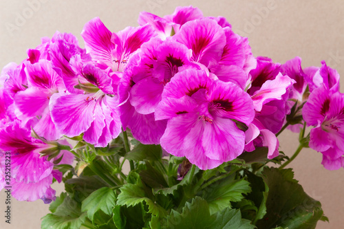 Purple royal pelargonium flowers and green leaves, grandiflora pelargonium close-up