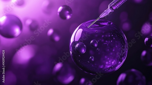 Purple serum injection, lab backdrop. Medical research, skincare ad