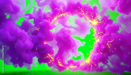 Purple Smoke Around Golden Portal with Sparks Isolated on Green Screen Background for Vfx Elements in a Fantasy Theme at Top Angle