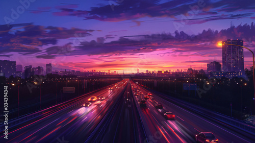 Purple Sunset Over City Highway for Urban Landscape or Travel Photography