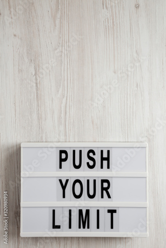 'Push your limit' words on a lightbox on a white wooden background, top view. Overhead, from above, flat lay. Copy space.
