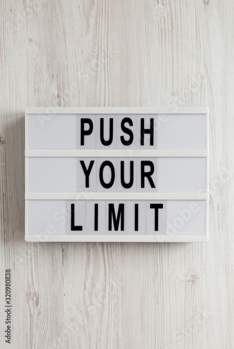 'Push your limit' words on a lightbox on a white wooden surface, top view. Overhead, from above, flat lay. Copy space.