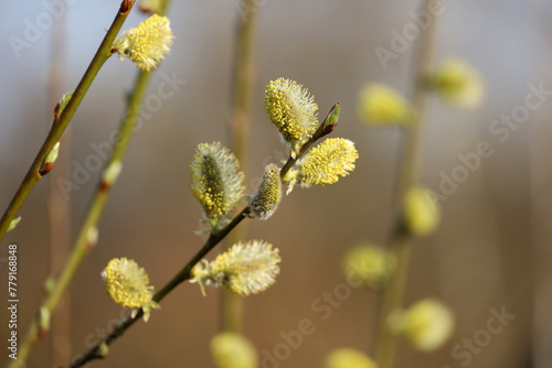 Pussy willow on the branch on blurred nature background, yellow blooming verba in spring forest. Palm Sunday symbol, catkins for Easter holiday