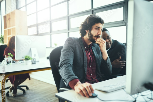 Putting their heads together. Cropped shot of two businessmen working on a computer in their office.