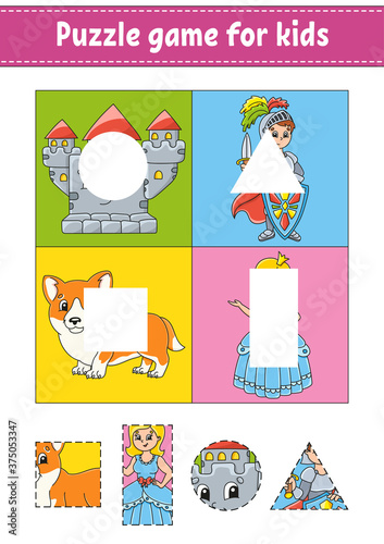 Puzzle game for kids. Cut and paste. Cutting practice. Learning shapes. Education worksheet. Circle, square, rectangle, triangle. Activity page.Cartoon character.