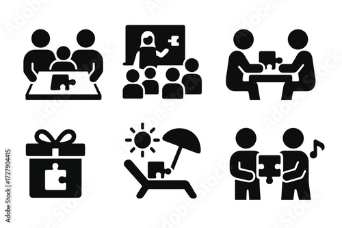 Puzzle Icon Set. Solid, filled icon set of puzzle occasions: family game night, classroom activity, puzzle contest, gift, holiday, relaxation, mental exercise,