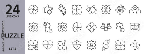 Puzzle line icons set with Solution, Jigsaw, Strategy, Connection, Brain, Piece, Success and more. Editable Stroke