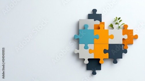 Puzzle of Growth: Interlocking jigsaw pieces in vibrant colors come together with a touch of nature, symbolizing harmony and integration.