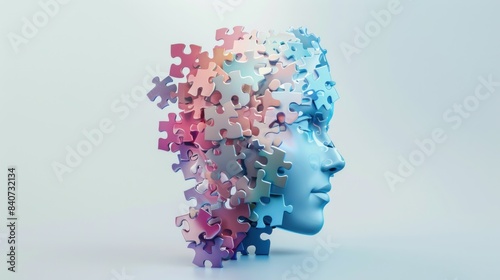 Puzzle pieces forming woman's head conceptual image on white background representing mindfulness and psychology