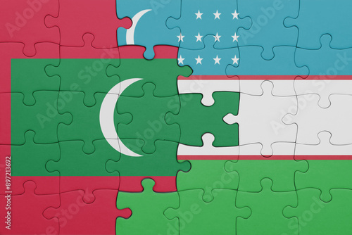 puzzle with the colourful national flag of maldives and flag of uzbekistan .