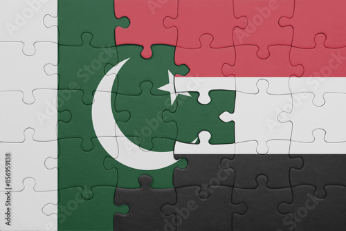 puzzle with the colourful national flag of yemen and flag of pakistan .