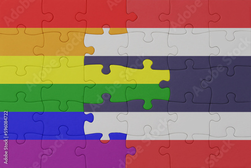 puzzle with the flag of rainbow gay pride and thailand . macro.concept.