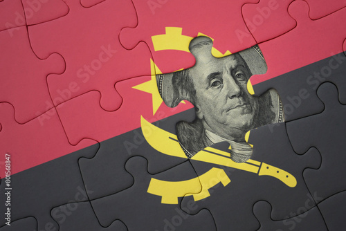 puzzle with the national flag of angola and usa dollar banknote. finance concept