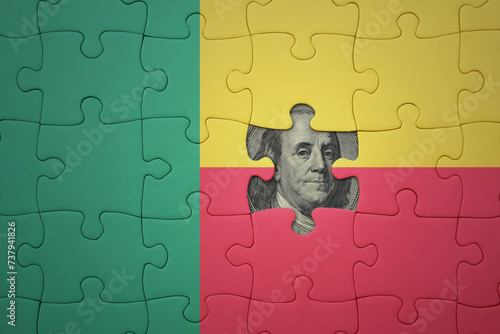 puzzle with the national flag of benin and usa dollar banknote. finance concept