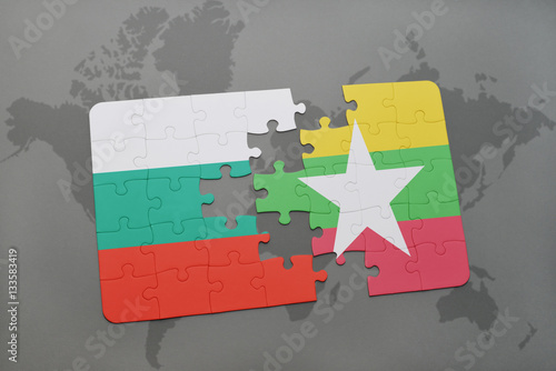 puzzle with the national flag of bulgaria and myanmar on a world map