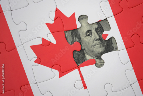 puzzle with the national flag of canada and usa dollar banknote. finance concept