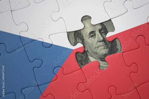 puzzle with the national flag of czech republic and usa dollar banknote. finance concept