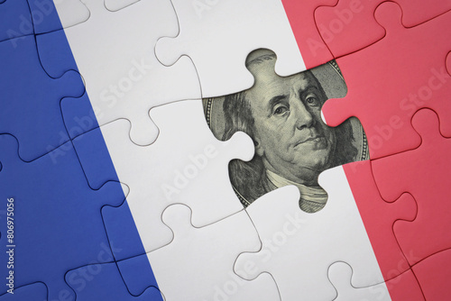 puzzle with the national flag of france and usa dollar banknote. finance concept