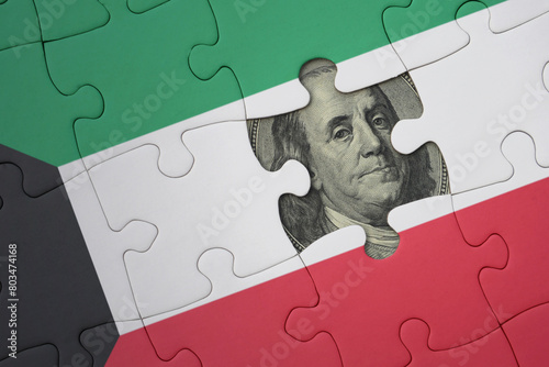 puzzle with the national flag of kuwait and usa dollar banknote. finance concept