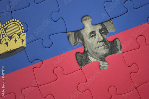 puzzle with the national flag of liechtenstein and usa dollar banknote. finance concept