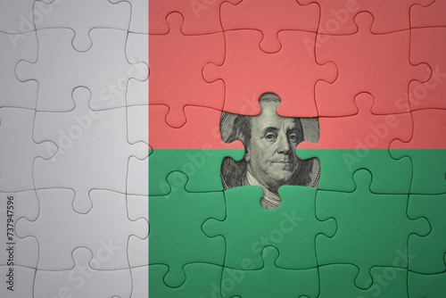 puzzle with the national flag of madagascar and usa dollar banknote. finance concept