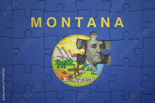 puzzle with the national flag of montana state and usa dollar banknote. finance concept