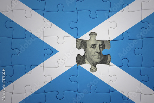 puzzle with the national flag of scotland and usa dollar banknote. finance concept