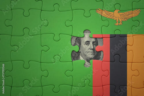 puzzle with the national flag of zambia and usa dollar banknote. finance concept