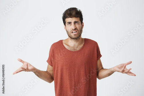 Puzzled and clueless bearded man with stylish hairstyle dressed in casual clothing shrugging shoulders and staring at camera with confused look after he made mistake but not feeling guilty for that.
