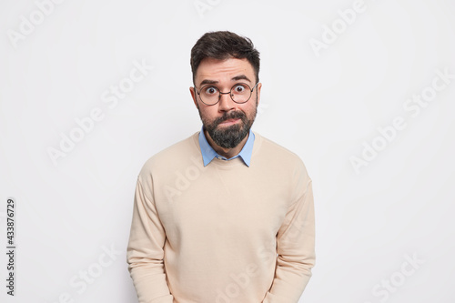 Puzzled bearded adult man purses lips reacts on astonishing news wears round optical spectacles and casual neat sweater isolated over white background. Human face expressions and reactions concept