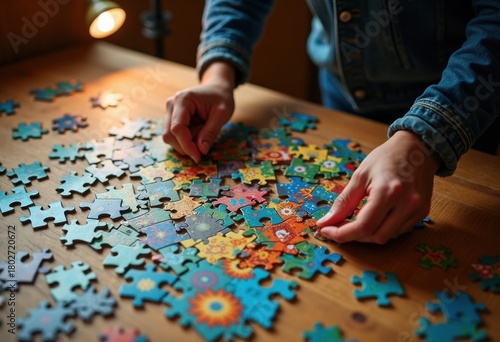 Puzzled Enthusiast Completing A Thousand Piece Challenge Surrounded By Colorful Jigsaw Fragments