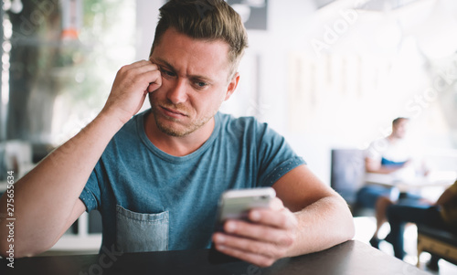 Puzzled male blogger feeling tired from online messaging with followers from own website using smartphone application during leisure in cafeteria, concept of millennial people and generation