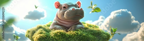 pygmy hippo baby with glossy wet skin and adorable pink blushes, sitting on a green cloud network platform, floating in a sunny landscape with bright blue skies